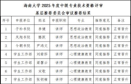 根据《海南大学人事处关于开展2025年度专业技术资格评审工作的通知》(海大人〔2025〕13号)文件要求,经学生工作部(学生工作处、人民武装部)2025年度中级专业技术资格评审基层推荐委员会审议并投票表决,同意推荐李健等7名老师申报中级专业技术资格。